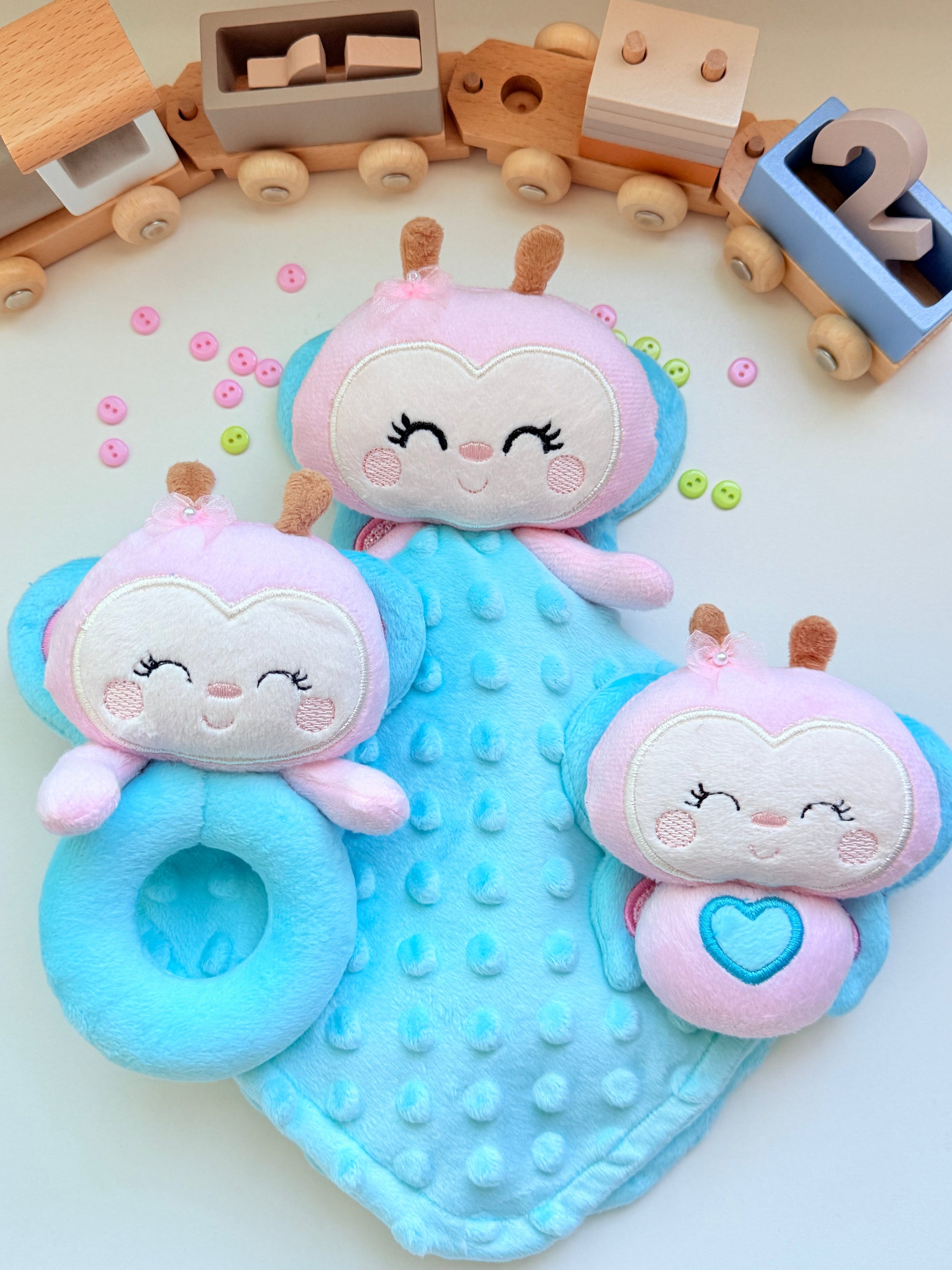 Todos nuestros juguetes están hechos a mano con materiales de alta calidad, suaves y no tóxicos. Son seguros para que los recién nacidos los acurruquen y perfectos para el desarrollo sensorial.